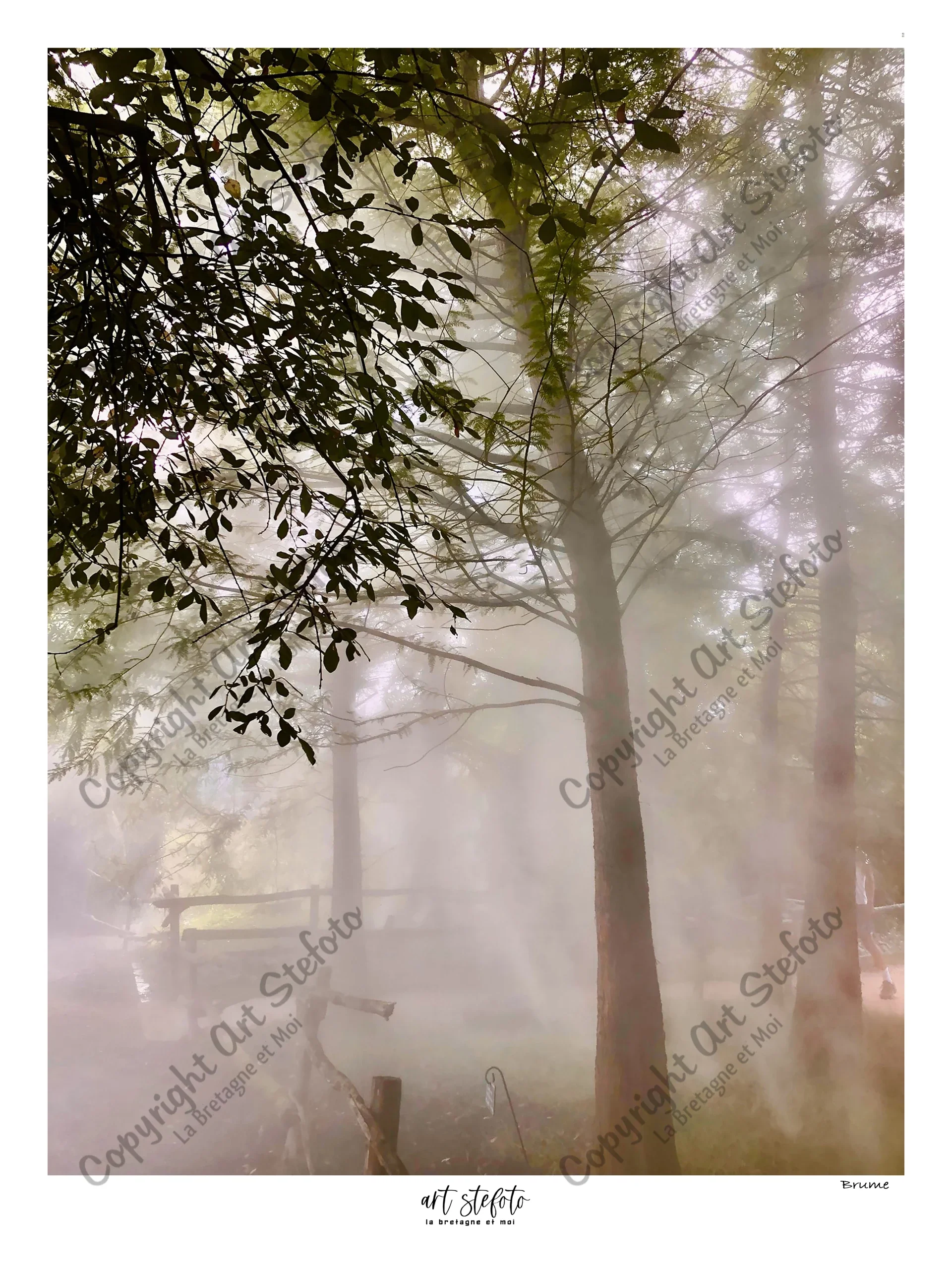 Sous la brume matinale, les arbres se dessinent dans une atmosphère silencieuse et enveloppante.