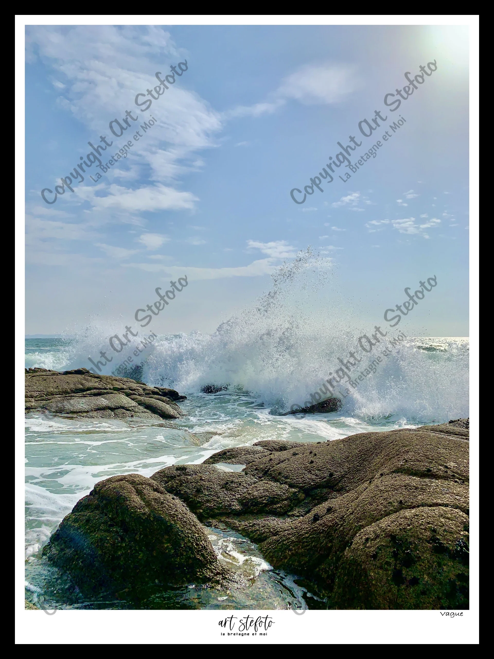Les vagues bretonnes se teintent de nuances profondes — bleu, vert, écume et lumière dorée — dans une composition à la fois vive et apaisante.