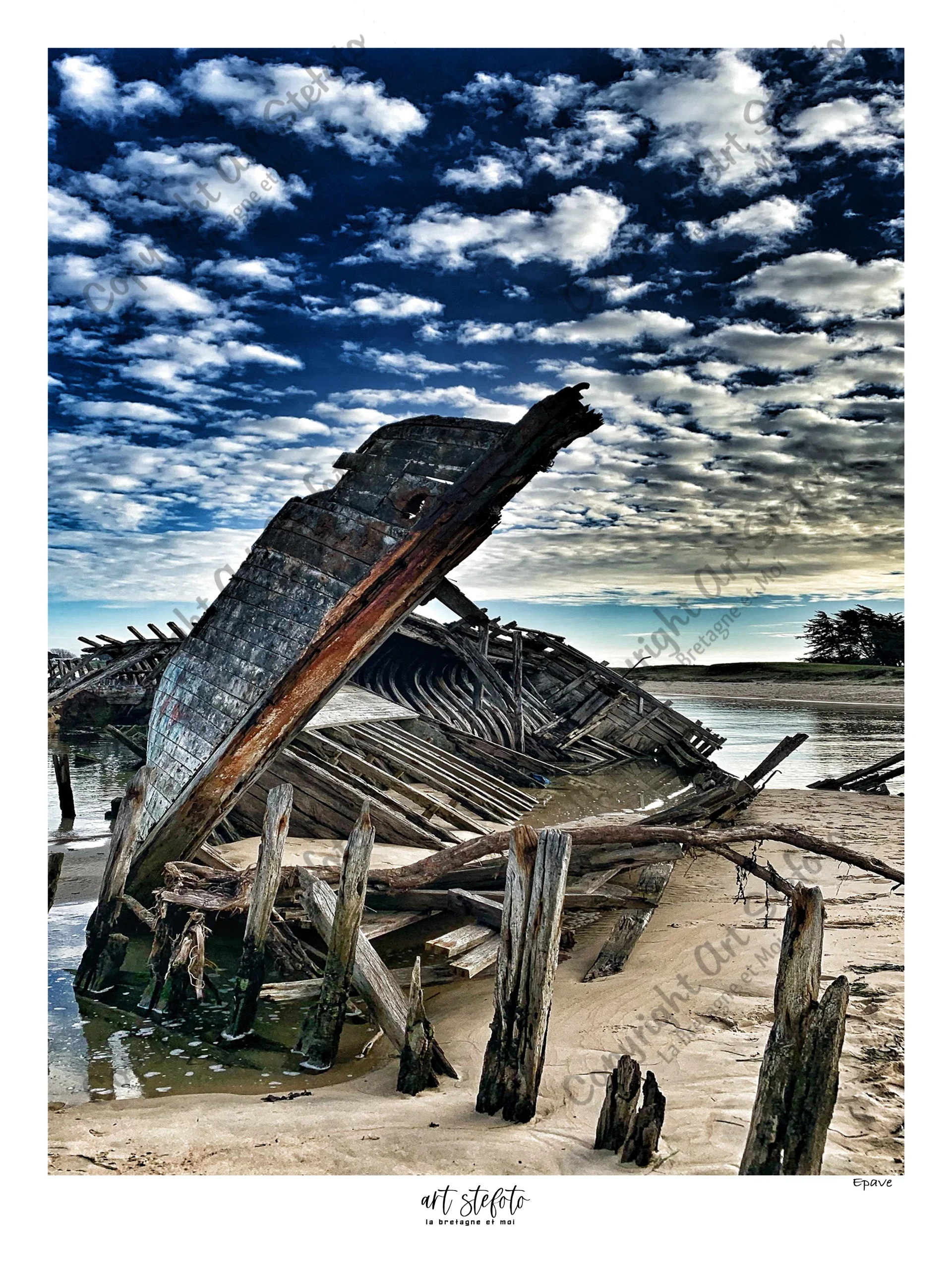 Sur la côte bretonne, une épave repose face à un ciel lourd et mouvementé. Entre ombre et lumière.